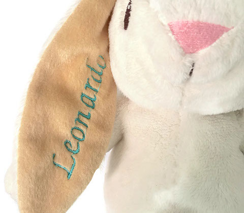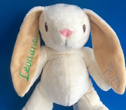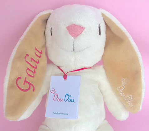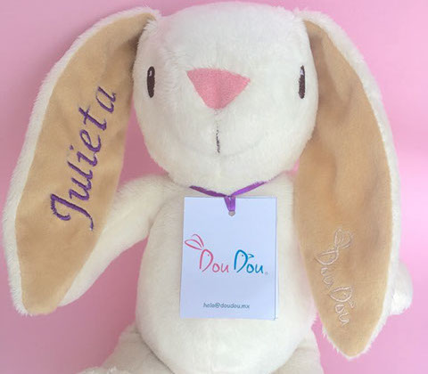 Ahora puedes tener al conejo Dou, con el nombre de tu pequeñ@!! un detalle que lo hace más único y especial. El nombre va bordado a lo largo de su oreja derecha. Tú solo nos dices el nombre, escoges el color y listo!” Sin duda el mejor regalo!